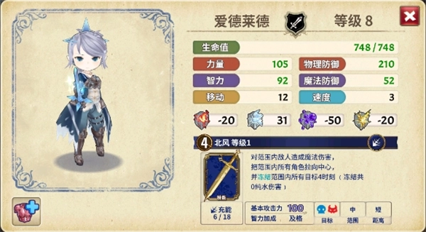 技能特点:拥有技能 “北风”(等级 1),消耗 4 点能量,能对范围内敌人造成魔法伤害,把范围内所有角色拉向中心,并在范围内四角出现 4 道冰刺(冻结共 0 纯水伤害)。从属性上看,爱德莱德力量和物理防御较高,可在战斗中承担一定的近战输出和前排承伤角色,技能 “北风” 具备控制和伤害能力,能聚拢敌人并造成伤害,在团队战斗中可配合队友打出更多输出。
