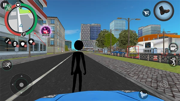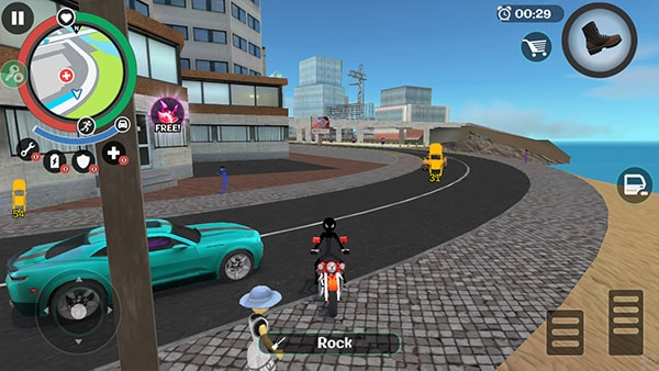 左侧移动、加速,右侧绳索,攻击(跳跃),跳跃,右上侧的武器更换以及血量、经验的显示都实时更新,一览无遗,凭借着大家自由的玩法,与其他帮派的人物进行交火,期间杀敌人能够获得经验,杀多了会产生星级,巡警和其他附近角色会特殊照顾你对你展开火热的进攻,而如何存活,如何将其他人物击杀则是你所需要完成的任务。