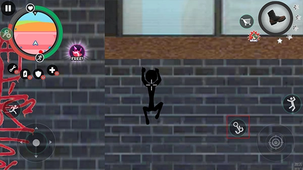 5、点击左侧的摇杆可以控制火柴人进行移动,点击右侧的钩子可以化身蜘蛛侠自由穿梭,点击“人”的图标可以跳跃,点击瞄准镜图标可以进行攻击。