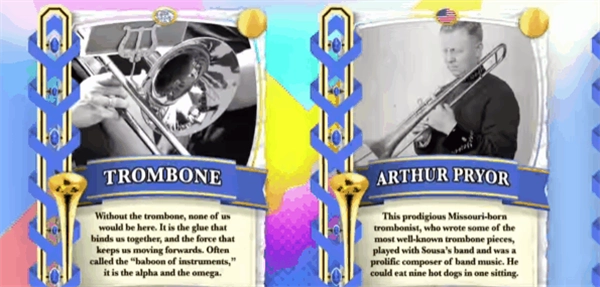《长号冠军》(Trombone Champ)拥有超20首曲目,涵盖国歌、进行曲、古典乐曲、电子乐、民间经典等。这款游戏里还有令人兴奋的客座艺术家曲目。每首曲目都配有独特的动画背景,会随音乐而动!