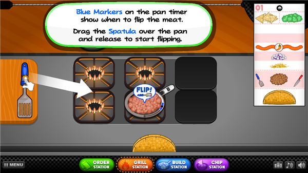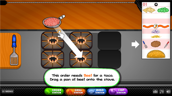2、每份顾客订单都意味着一次动手实践。玩家要轻松完成各类不同口味的塔可订单制作,第一步,玩家需将肉锅放在火炉上进行烹饪。