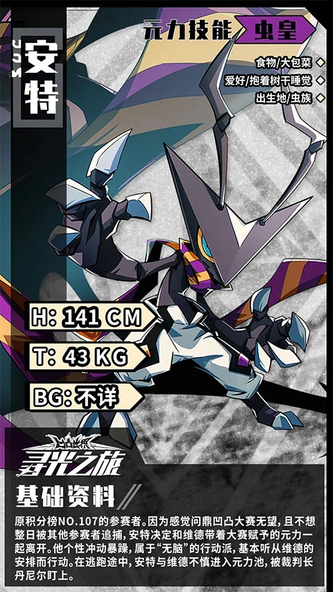 安特,原积分榜NO.107的参赛者。因为感觉问鼎凹凸大赛无望,且不想整日被其他参赛者追捕,安特决定和维德带着大赛赋予的元力一起离开。