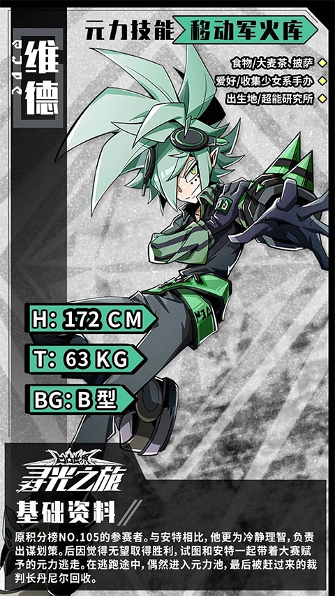 维德,原积分榜NO.105的参赛者。与安特相比,他更为冷静理智,负责出谋划策。后因觉得无望取得胜利,试图和安特一起带着大赛赋予的元力逃走。在逃跑途中,偶然进入元力池,最后被赶过来的裁判长丹尼尔回收。