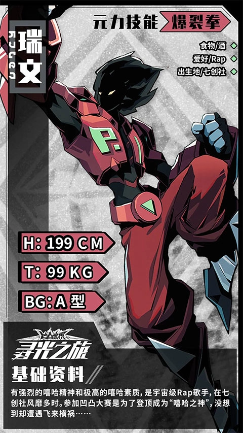 瑞文,有强烈的嘻哈精神和极高的嘻哈素质,是宇宙级Rap歌手,在七创社风靡多时。参加凹凸大赛是为了登顶成为“嘻哈之神”,没想到却遭遇飞来横祸。