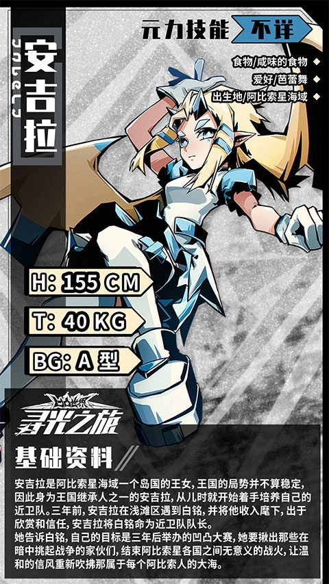 安吉拉,阿比索星海域一个岛国的王女,王国的局势并不算稳定,因此身为王国继承人之一的安吉拉,从儿时就开始着手培养自己的近卫队。三年前,安吉拉在浅滩区遇到白铭,并将他收入麾下,出于欣赏和信任,安吉拉将白铭任命为近卫队队长。