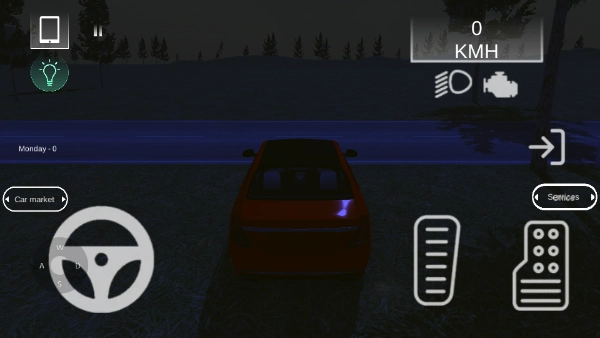 4、左边的轮盘控制车的方向,右边分别为刹车和后退,点击右上角可开远光灯。