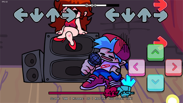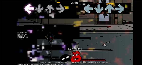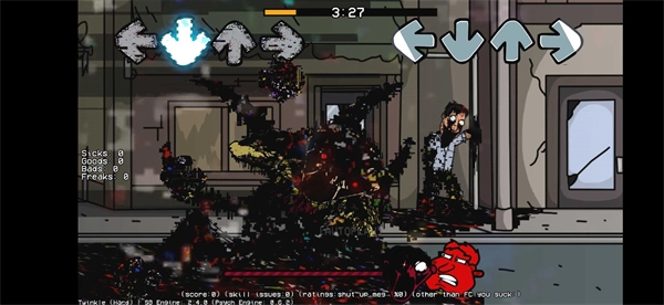 4、想要打败boss,你得跟着节拍和音乐,及时按下箭头。屏幕下方是游戏进度条,尽量让它靠左。要是你热衷于挑战手速,还喜欢各种模组版本,那周五放克夜错误化模组整合版可一定得试试。