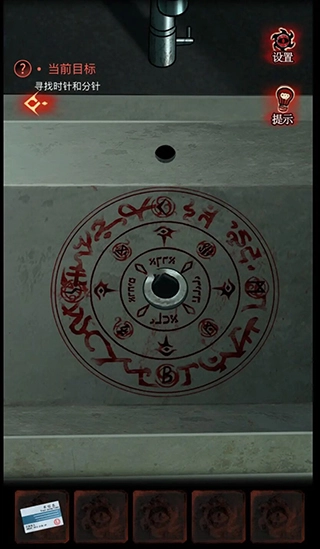 4、用钥匙打开右侧带锁的抽屉,从中获取【毛巾】和【分针】。之后回到贩卖机那里,点击镜子(镜子上有只瓢虫,会冷不丁出现一只手将瓢虫拍死),这时能看到时钟指向3:00 。接着用毛巾擦掉右侧门上的图案,进入卫生间,在柜子上层的红色书本里得知算式,点击照片能发现文字,红色图案下方对应的数字是3 。