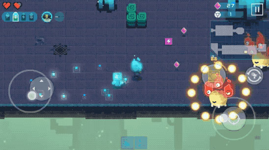 同复古像素画风的《元气骑士》类似,《比特小队》同样采用了经典的像素风格作为主基调,但人物则是卡通风格。这两者之间的搭配加上科技背景的渲染,整个游戏有一种身处电子世界的异样感觉,很契合BIT这个主题。而不同的是,相比于画风阴暗和压抑的《元气骑士》,《比特小队》则表现地更加明亮和欢快,给人的感觉更加舒服。游戏中有很多不同的怪兽,同人物一样,大多也采用的是卡通型的美术风格,而且其造型大多偏向于搞怪,例如石头人等等,颇为可爱。