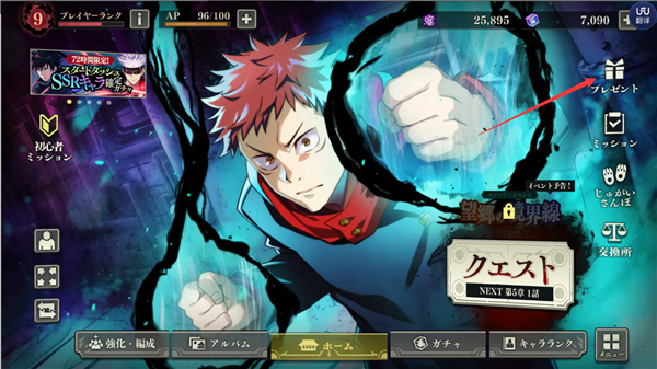 在主界面,可以使用公告、礼物、任务等功能,并前往交换所、关卡功能所在界面。还可通过点击屏幕上方的“+”图标,购买回珠或回复AP。
