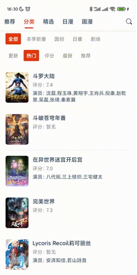 2、分类页面简洁明了,包括日漫、国漫、剧场等分类,还有更新、热门、评分、最新、推荐等功能。