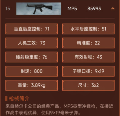 来自赫尔卡公司的经典产品,MP5微型冲锋枪,在接近作战中表现优异,使用9×19毫米子弹。