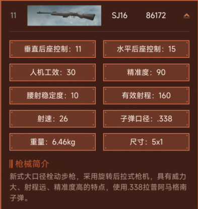 新式大口径栓动步枪,采用旋转后拉式枪机,具有威力大、射程远、精准度高的特点,使用.338拉普阿马格南子弹。