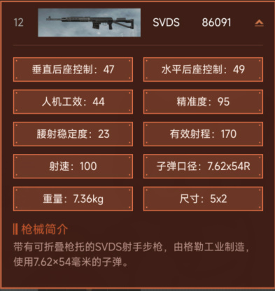 带有可折叠枪托的SVDS射手步枪,由格勒工业制造,使用7.62×54毫米的子弹。