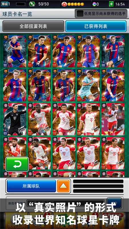 除了阿根廷国家队、巴西国家队、葡萄牙国家队等争夺世界冠军的强队外,还有巴塞罗那、利物浦、阿森纳等著名球队的明星球员的真实照片卡。来收集明星球员,不断加强他们,形成自己最强的球队。