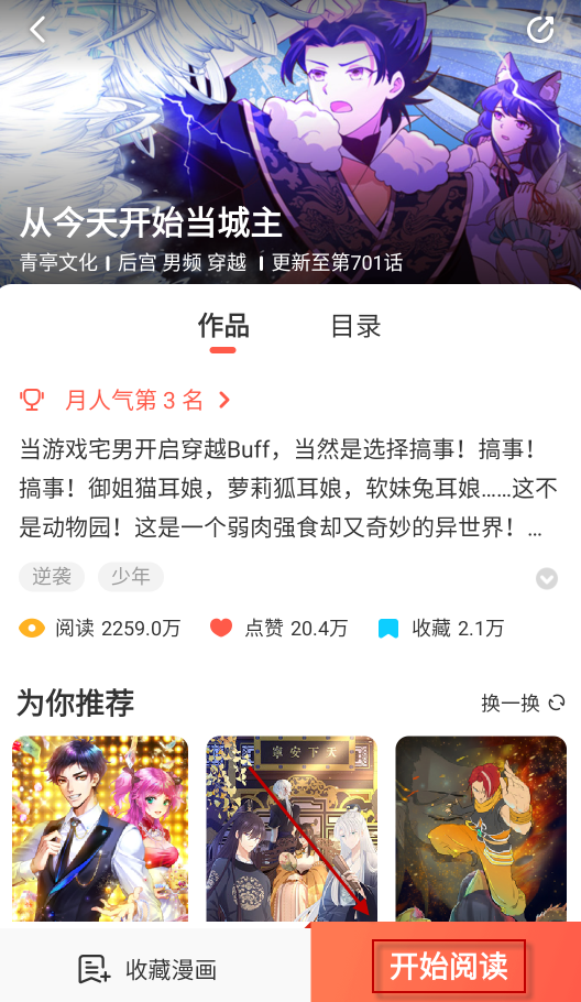 3、选择任意漫画进入详情页面,点击“开始阅读”即可观看。