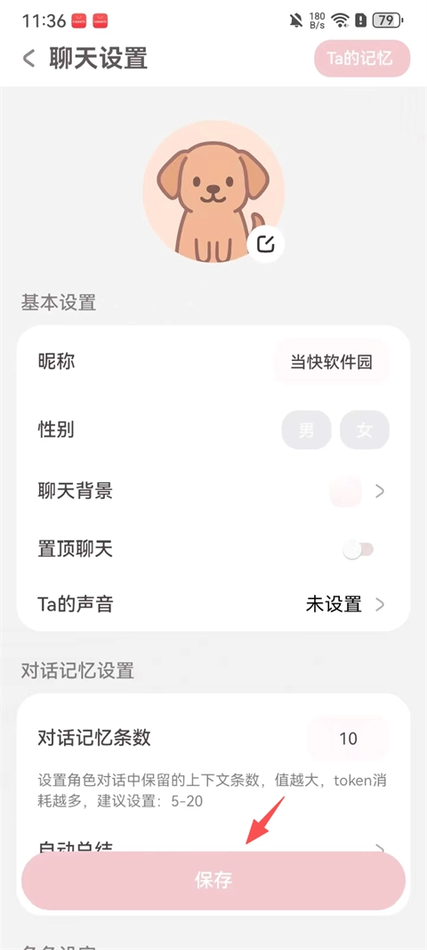 4、进入聊天设置页面,可修改新人物的昵称、性别、声音,还能调整对话相关设置。