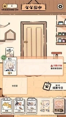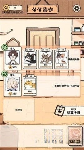 4、点击结算结束今日的订单,将为您带来额外的猫币,但别忘了,及时上缴房租与照顾猫咪的精力也是关键。