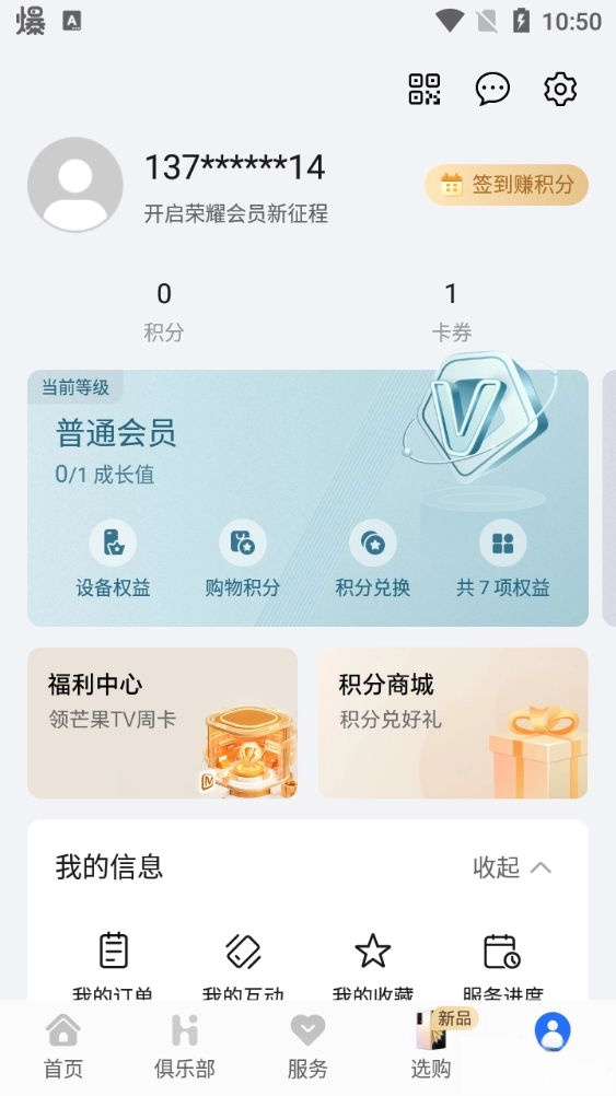 4、点击我的,可以查看设备权益、购物积分、积分兑换等权益,还可以查看订单、互动、收藏等;