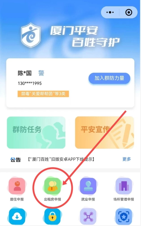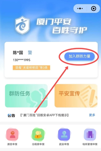 “厦门百姓”是一个集自主申报、线索举报、巡逻防范、应急救援、平安宣传等功能为一体的 “互联网+群防群治”工作平台。