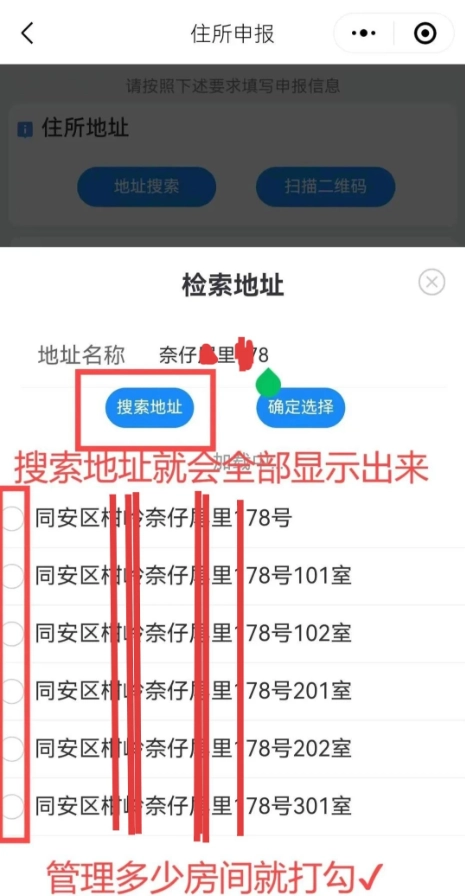 9、输入地址名称后就点击:搜索地址,管理的房间号都打勾