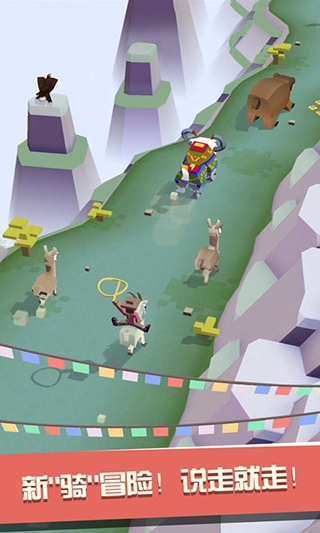 2、接近目标动物后,松开手指跳跃至其背上,接着按住屏幕控制方向躲避障碍,当红色进度条填满后即可成功驯服该动物。