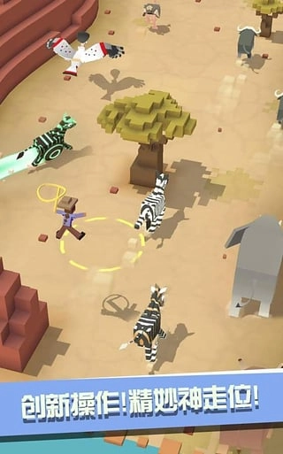 游戏的操作方式简单易上手。开局时你会自动骑乘一头野牛,进入地图后持续按住屏幕控制奔跑。当看到头顶有“new”标志的新动物时,调整位置靠近它并松开手指,角色便会飞跃至新动物身上,随后点击屏幕完成捕捉动作。