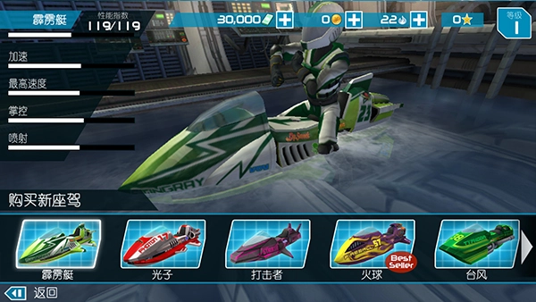2、当金币足够时,进入商城页面,选购心仪的摩托艇。