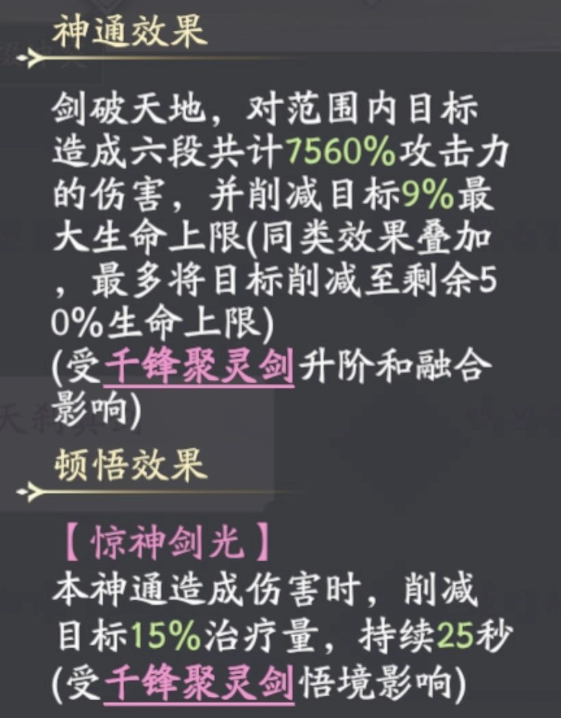 技能描述:万剑齐发,对范围内敌人造成五段共计580%攻击力的伤害,并触发【聚灵】效果。