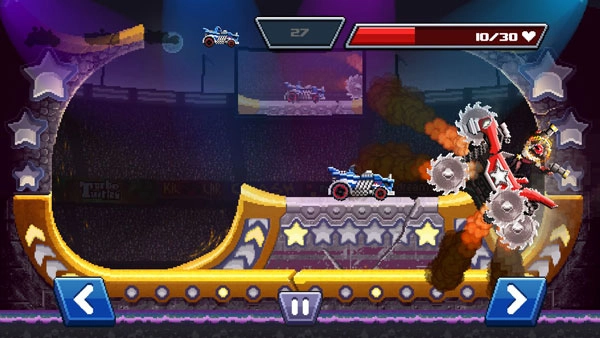 操作方面,《撞头赛车》采用固定方向键控制,看似简单却并不容易掌握,车辆重心控制非常讲究,稍快就会翻车。不过这也为战术提供了空间,比如利用翘起前轮的方式压击对手,极具观赏性。