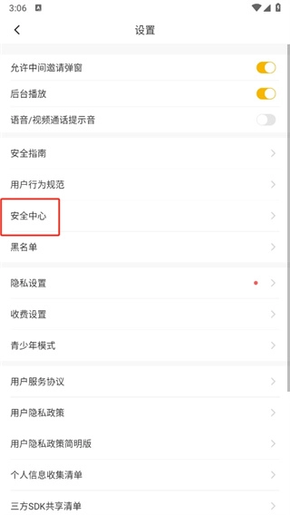 3、接着来到设置的页面中,在这里我们点击【安全中心】;Space