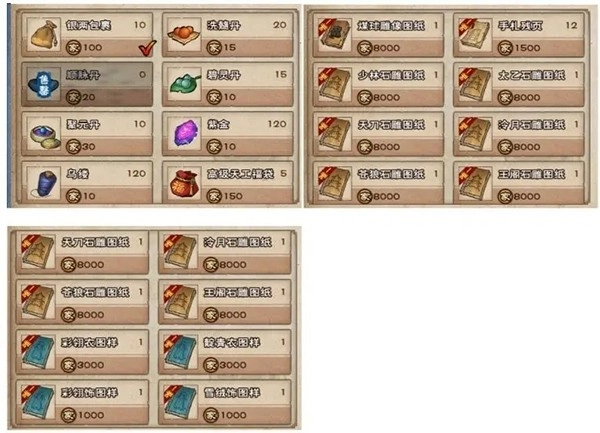 庭院(1500元宝,含耳房+凉亭图纸)、府邸(3000元宝,配备耳房、凉亭及游廊图纸)