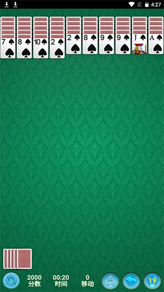 游戏初始分数设定为500分,玩家每进行一次移动或撤销操作,分数就会扣除1分。当玩家成功将一组同花色的牌按照从K到A的顺序排列好后,这组牌会被移除,同时玩家将获得100分的奖励。游戏中的得分允许出现负数情况;不过,若玩家在分数为负的状态下使用撤销操作,分数将被重置为0。