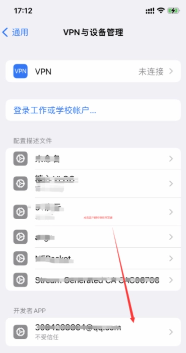 这个时候,打开手机设置,依次进入通用选项、科学上网设备管理页面,之后信任对应的开发者就可以了。