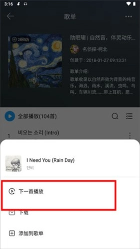 点击歌曲右侧的更多选项,选择“下一首播放”,即可将该歌曲插入到播放队列中。
