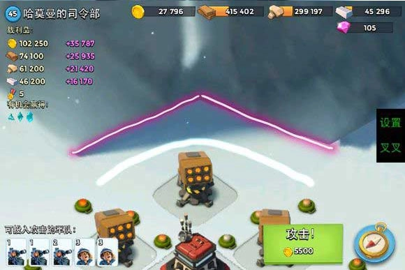 2、通过战斗获取资源,升级基地,抵御敌人入侵。