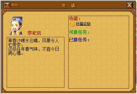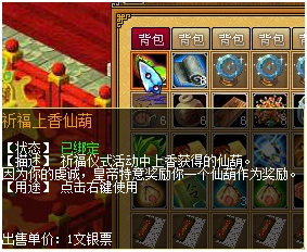 在祭祀官身边使用贡香可以进行祈福,祈福成功后可以获得角色经验和宠物经验(宠物参战状态)必定获得道具