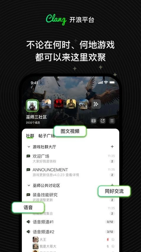 Clang是一个围绕兴趣搭建的社交平台,致力于为用户提供安全绿色的即时通讯服务。在这里,你可以轻松找到同好网友,随时在线聊天互动,还能组队开黑玩游戏,让生活充满乐趣;平台上有丰富的社群内容,包含各类游戏房间,你可以自由加入感兴趣的频道,和同玩一款游戏的伙伴交流,让交友过程更有乐趣;聊天方式也很多样,支持语音、图片、文字等多种形式,满足你和不同网友的沟通需求,让聊天更轻松顺畅;感兴趣的朋友赶紧来Clang最新版找搭子,一起体验趣味游戏吧!