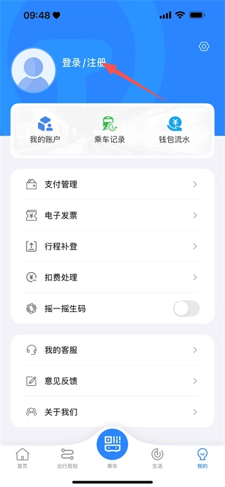 3、进入个人中心页面,点击登录/注册按钮,即可跳转至济南地铁的登录界面。