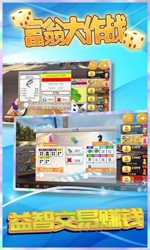 在游戏开始时,通过运气获得资本后,就可以买卖地产来吞并其他玩家的资产,也可以直接购买其他玩家的资产,直到他们无物可卖。