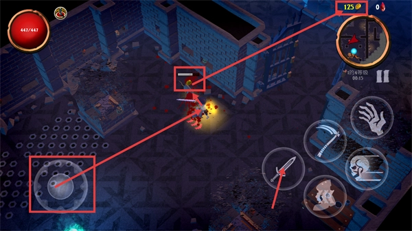 2、操控移动轮盘调整站位,用攻击按钮攻击带血条的敌人,关注【441/441-生命值】,击败敌人积累金币可提升至【4-等级】。