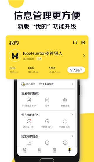 夜神猎人借助智能匹配系统,把符合条件的猎人与任务发布者对接起来。猎人能够在平台上查看各类兼职任务,依据自身的兴趣和能力挑选合适的任务承接,完成任务后就能得到对应的报酬。与此同时,任务发布者也可以在平台上发布任务,设置任务要求、报酬等相关信息,等候合适的猎人承接并完成。
