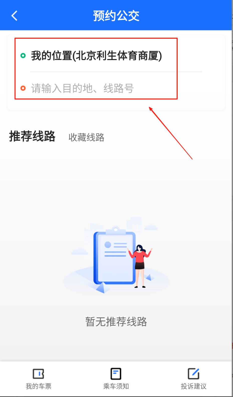 2、点击屏幕中间“请输入目的地、路线号”,输入想达到的目的地。