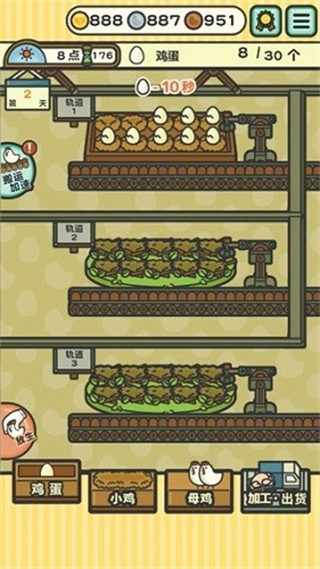 随着利润的不断积累,玩家可以解锁并升级鸡场里的各类设备,像孵化箱、饲养槽、加工机械之类的都能进行升级,这样一来就能提高养殖效率和产品质量,为鸡场规模的扩大以及收益的增长提供坚实的保障。