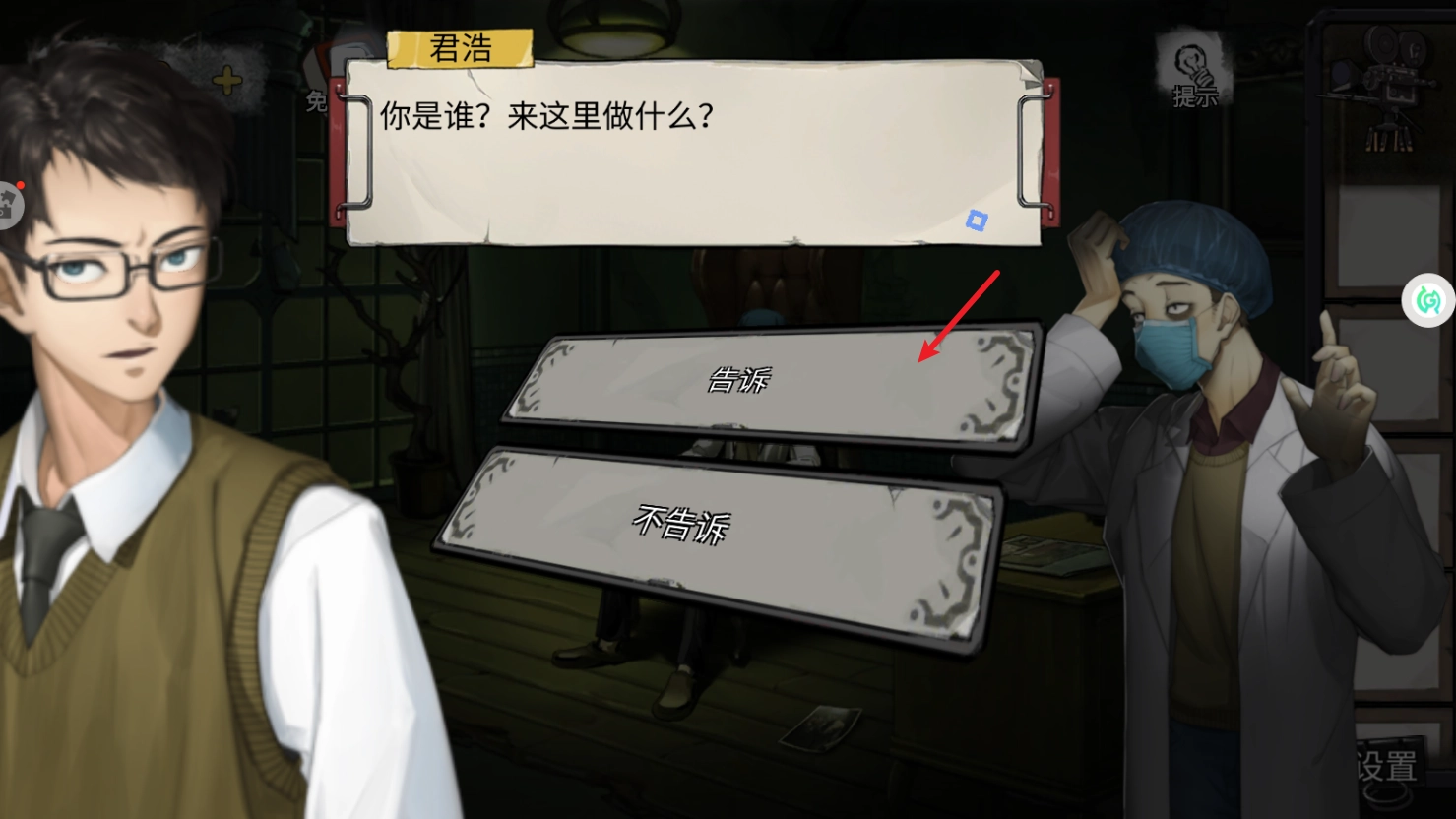 11、接着点击医生开始谈话,第一个选项选择告诉,然后第二个问题就可以选择照片,也就是刚刚找到的线索。