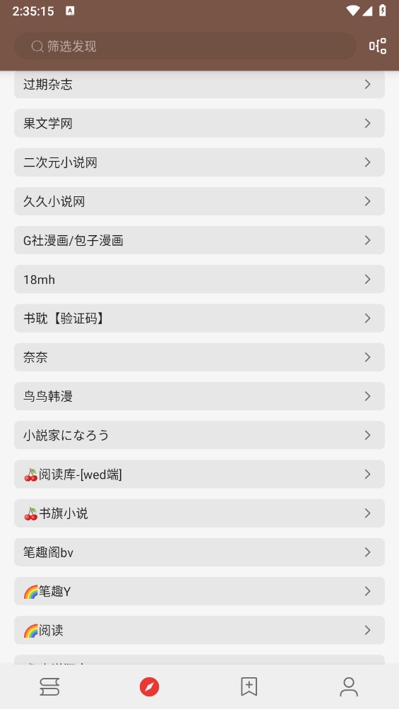 1、打开软件后,点击进入带有"+"号标识的页面,该页面如示意图所示,包含了多个不同的书源地址。