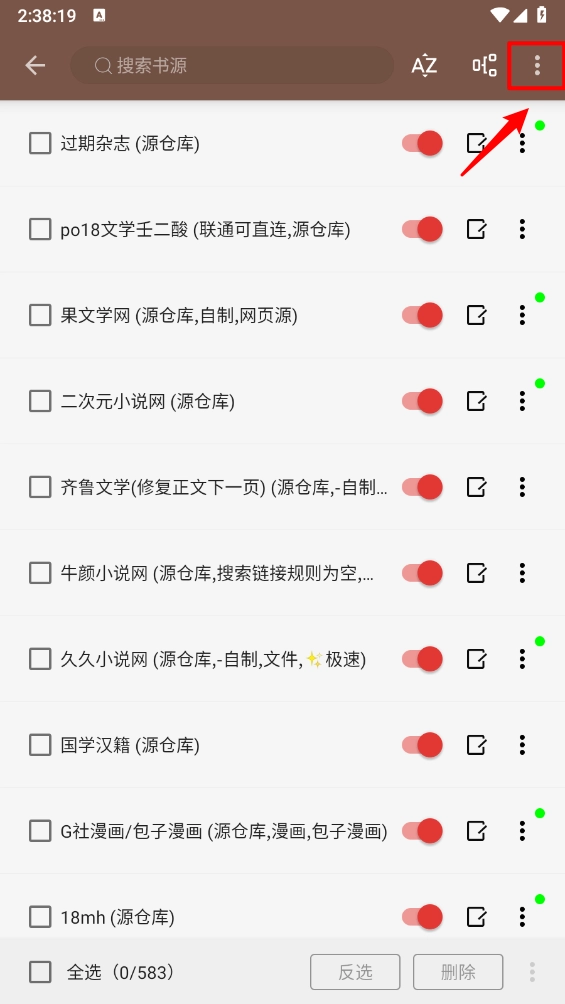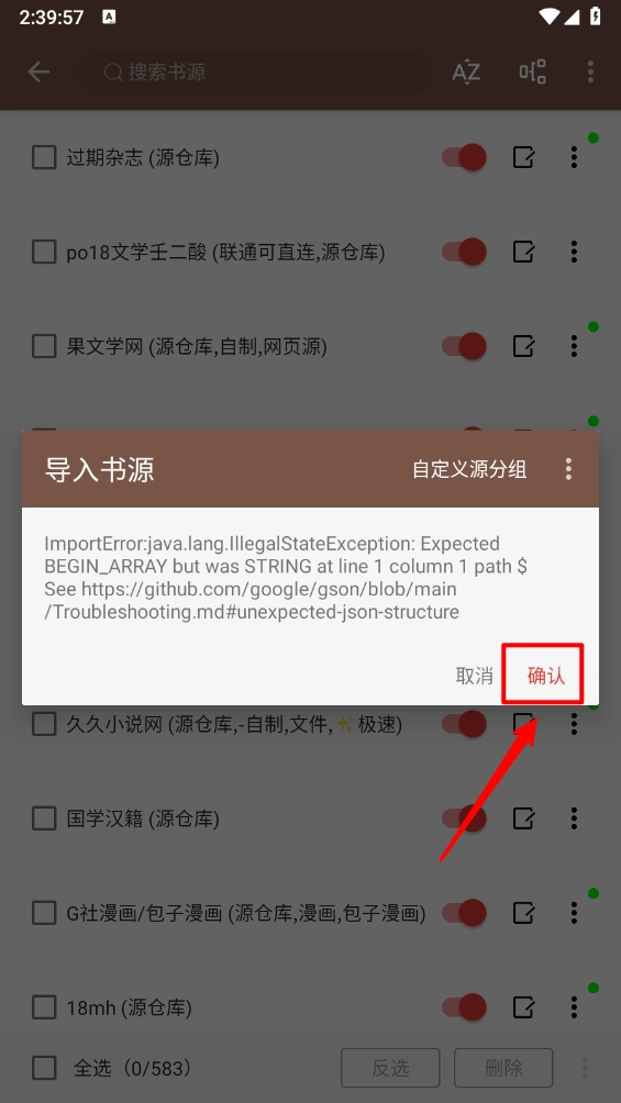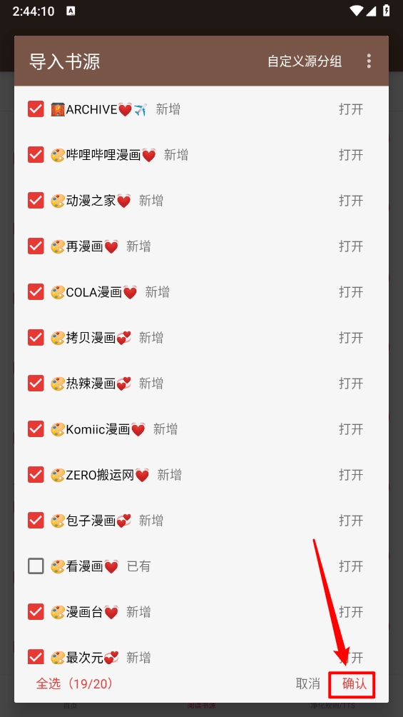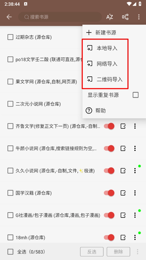 2、进入后滑动选择所需的书源,点击"一键导入"。