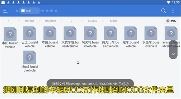 2、完成后,打开手机的文件管理应用,进入Android目录找到dats文件夹。例如,若mod文件在QQ群文件里,就依次点击tencent、QQfile,长按该mod文件,然后将其移动到BUSSID文件夹中。