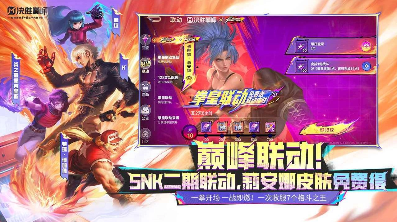8月14日至9月16日期间,拳皇系列的第二期联动活动将限时开启!此次联动推出了四款全新皮肤:古辛对应的「K'」、欧若拉对应的「库拉」、帕奎特对应的「特瑞·博加德」,以及狄牙对应的「大蛇克里斯」。同时,卡琳娜的「莉安娜」、周的「八神庵」和桂妮薇儿的「麻宫雅典娜」这几款皮肤也将限时返场!