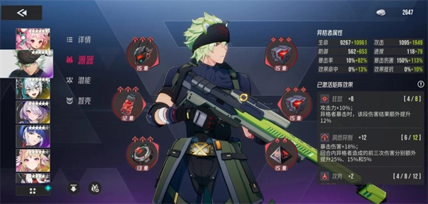 游戏的养成体系主要包含四个维度:源器(装备)、智壳(挂件)、潜能(固定属性与技能)以及等级。其中源器属于传统装备系统,玩家可装备6件,具体为左侧的面甲、晶管、腕轮各一件,右侧则是三件核心装备——这三件核心无明确部位划分,机制逻辑一致,可自由挑选三件佩戴。装备品质从蓝色到红色共分四档,不同品质间无机制差异,主要通过属性数值高低和套装点数多少来区分。左侧三件装备的主属性固定,依次对应攻击、生命、防御的固定数值,副属性词条在获取时随机生成;右侧核心装备的主属性则完全随机,有机会获得百分比类型的词条。